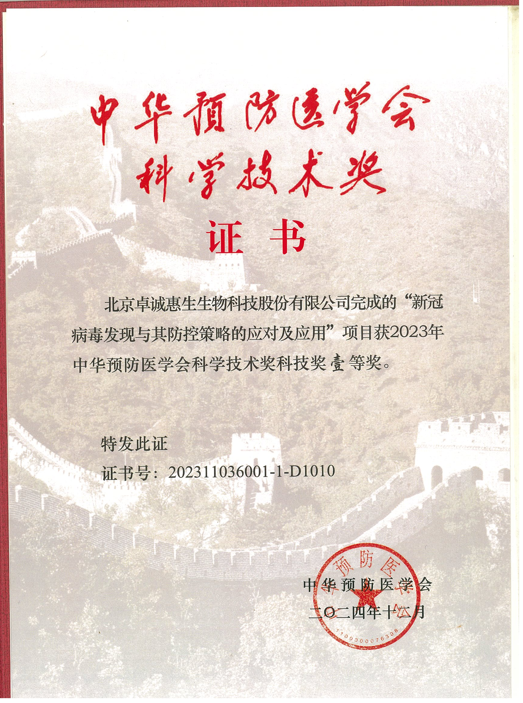 - 中華預防醫(yī)學會科學技術獎一等獎